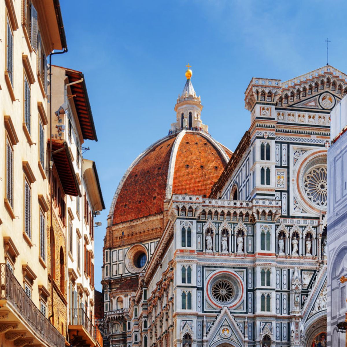 After crossing the old bridge is the classical-style city center. In the center you will notice a dazzling cathedral: the Cathedral of Santa Maria del Fiore (Cattedrale di Santa Maria del Fiore). The brick-red octagonal dome and the white, green and pink marbled exterior wall will attract you deeply. When you step into the church, the large dome at the end will draw you steps closer. When looking up at the Dome of Our Lady of the Flowers, you can’t help but admire the craftsmanship of Florence.