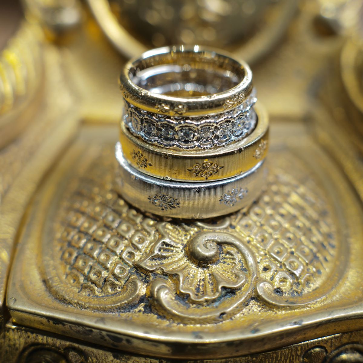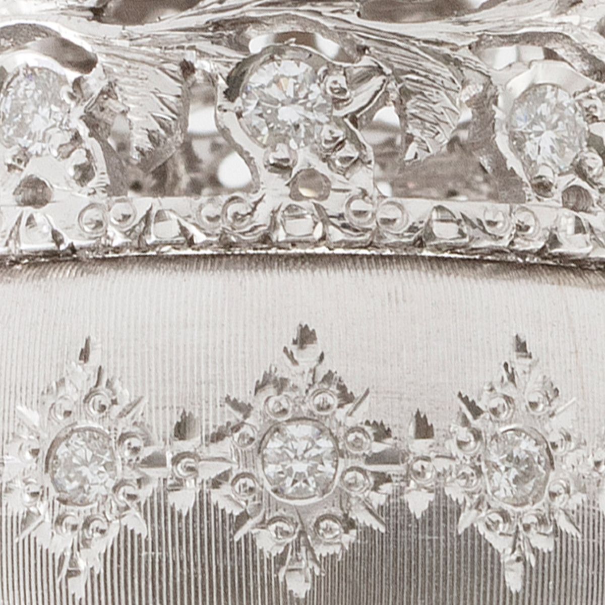 The Florentine engraving done by Seta by Meini seem to be complex but simple. There are two layers of carvings on the ring. The pattern on the bottom layer first covers the jewellery with a coat of silk, which creates an elegant and unobtrusive feeling; the delicate pattern on the surface adds just the sense of nobility. A few uneven carving lines permeate a strong sense of handwork, which is also the precious feature of Florentine engraving. Every stripe and every finished product also continues this long-standing craftsmanship.