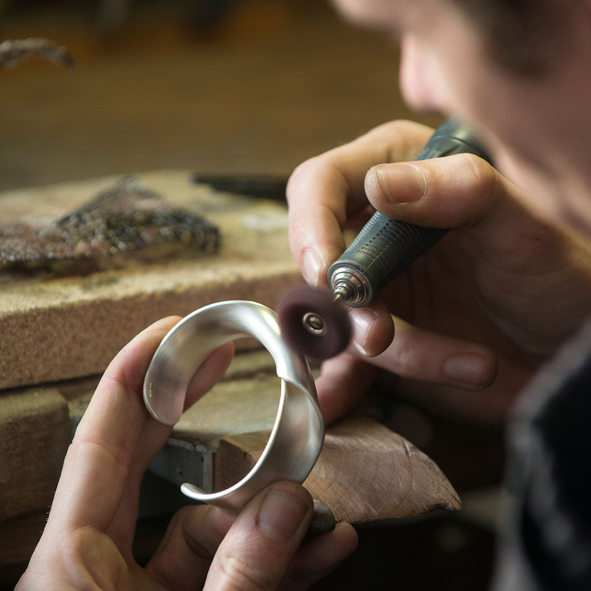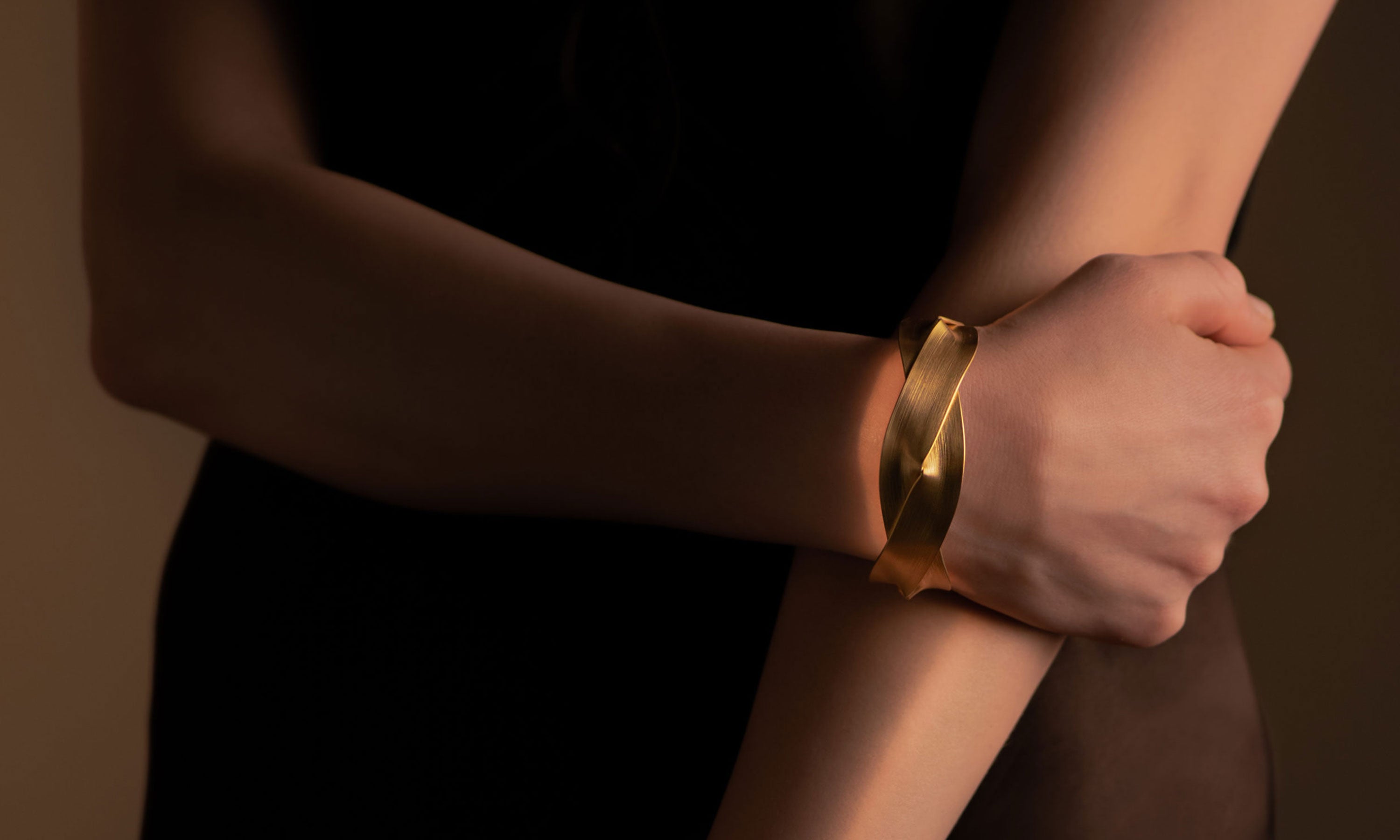 The jewels begin with a single strip of precious metal, crafted in Tilburg, Netherlands, using manual dexterity and physical force. The pieces are patterned with ultra-fine lines, resulting from a meticulous sanding process. HEYNE's savoir-faire is rooted in reflecting inner truth and avoiding decoration, ensuring the gold retains a sense of earthiness and authenticity.