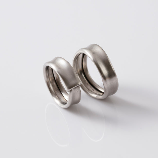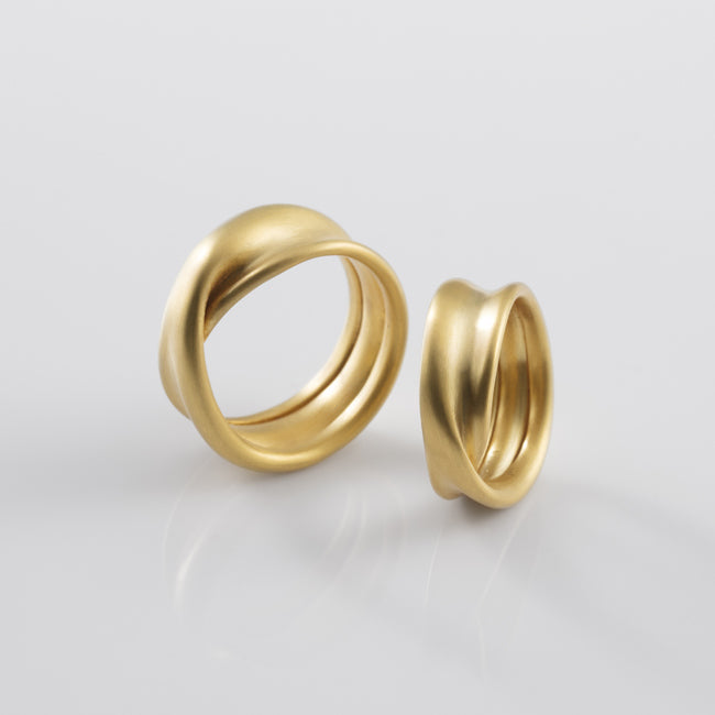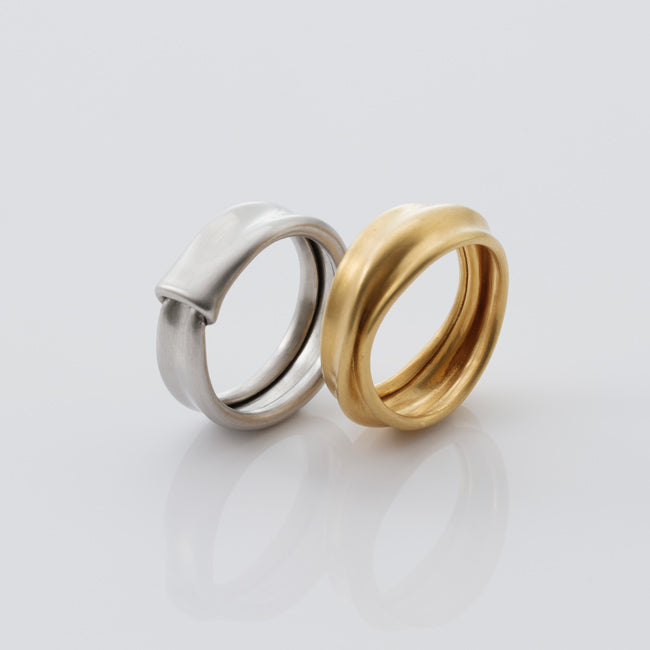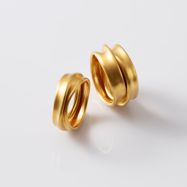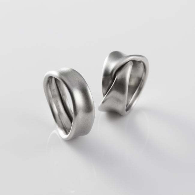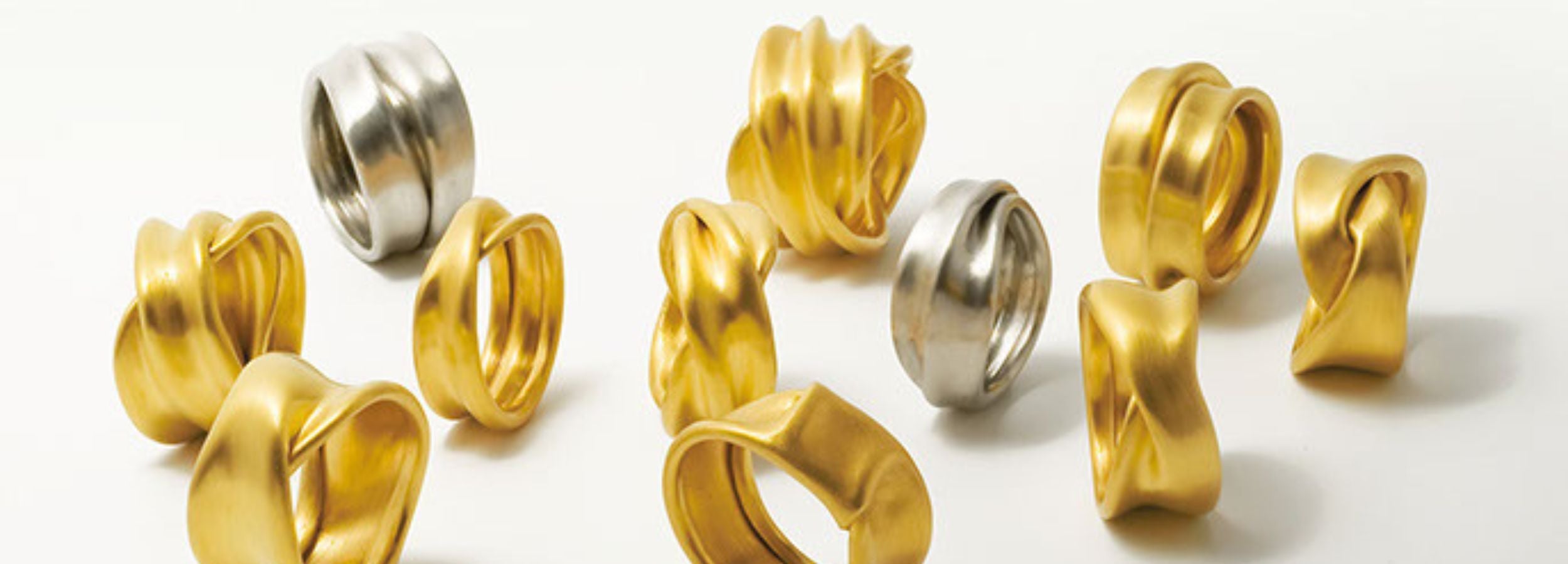 From years of experience in jewellery making, German goldsmith Rudi Sand has perfected the art of folding precious metals. The rings are like silk and cloth in a natural flow, and the earrings are like the flower petals of hydrangeas.