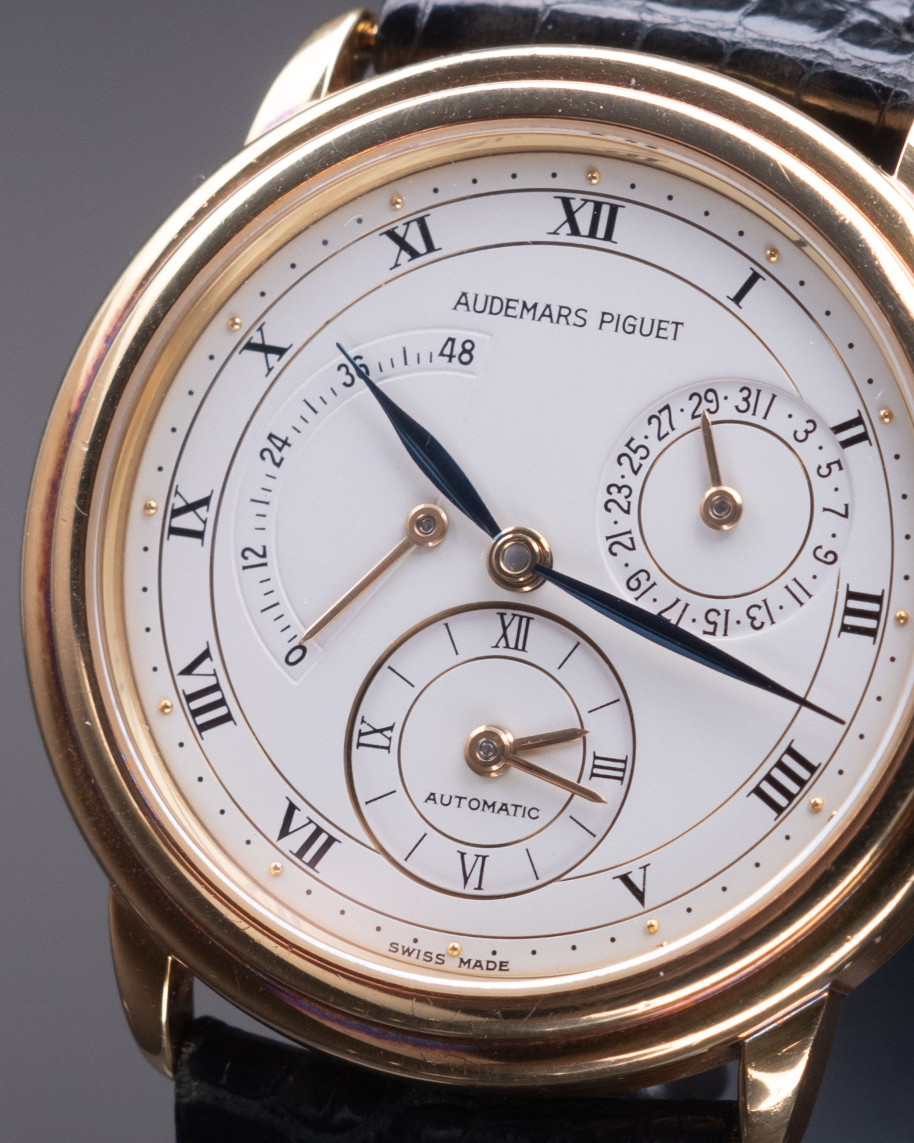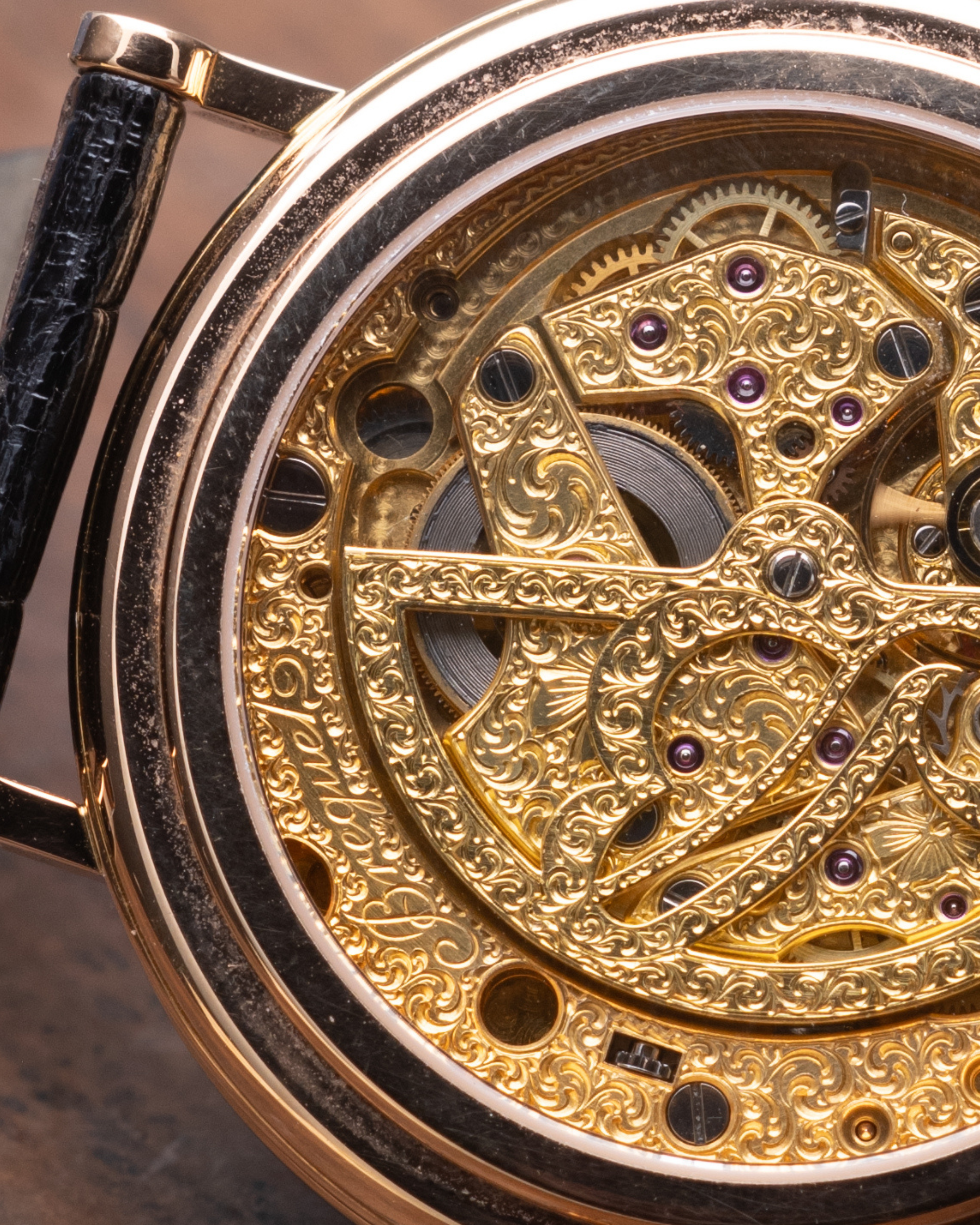 Breguet (寶璣) 是皇族喜愛的頂級尊貴品牌。此腕錶是Breguet最具代表性的作品,玫瑰金製造,錶底鏤空透視,具備日期、月相及動力儲存顯示功能,自動上鏈機能優越,設計古典優美。這隻dress watch絕對能夠突顯個人氣質修養與對美的追求。