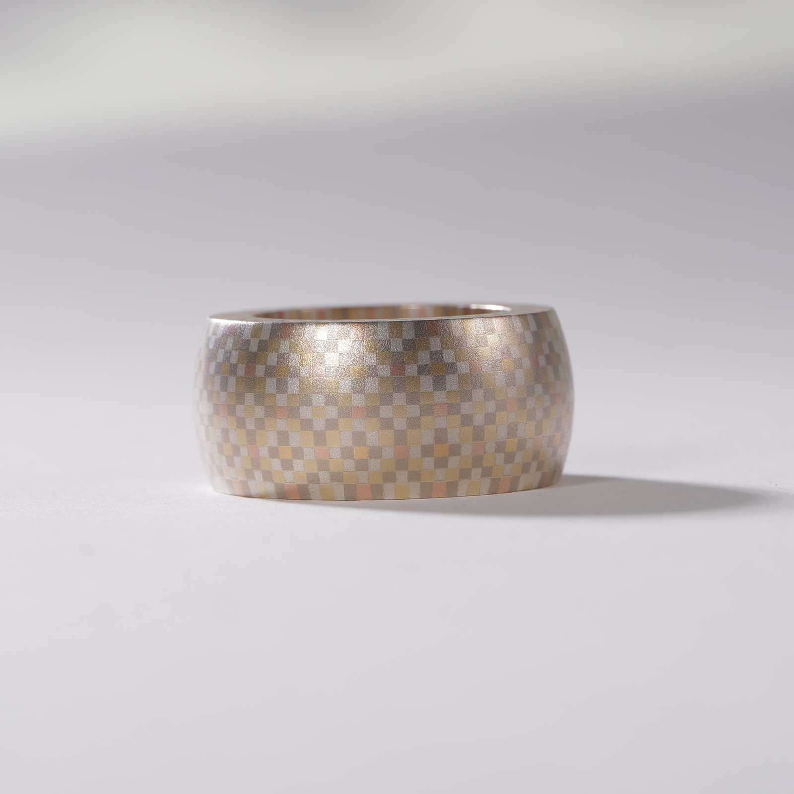 “Every Cube Matters” reflects the philosophy and practice of Japanese goldsmith Minoru Hotta. The pattern on this ring is not just for show, but a testament to years of dedication to the art of goldsmithing. Using the simplest techniques, different precious metals are drawn out, cut into cubes, and meticulously solder together. This process is repeated with utmost care and precision. The essence of this craftsmanship lies in a commitment to repetition and a determination to perfect simplicity, elevating it to a true art form.