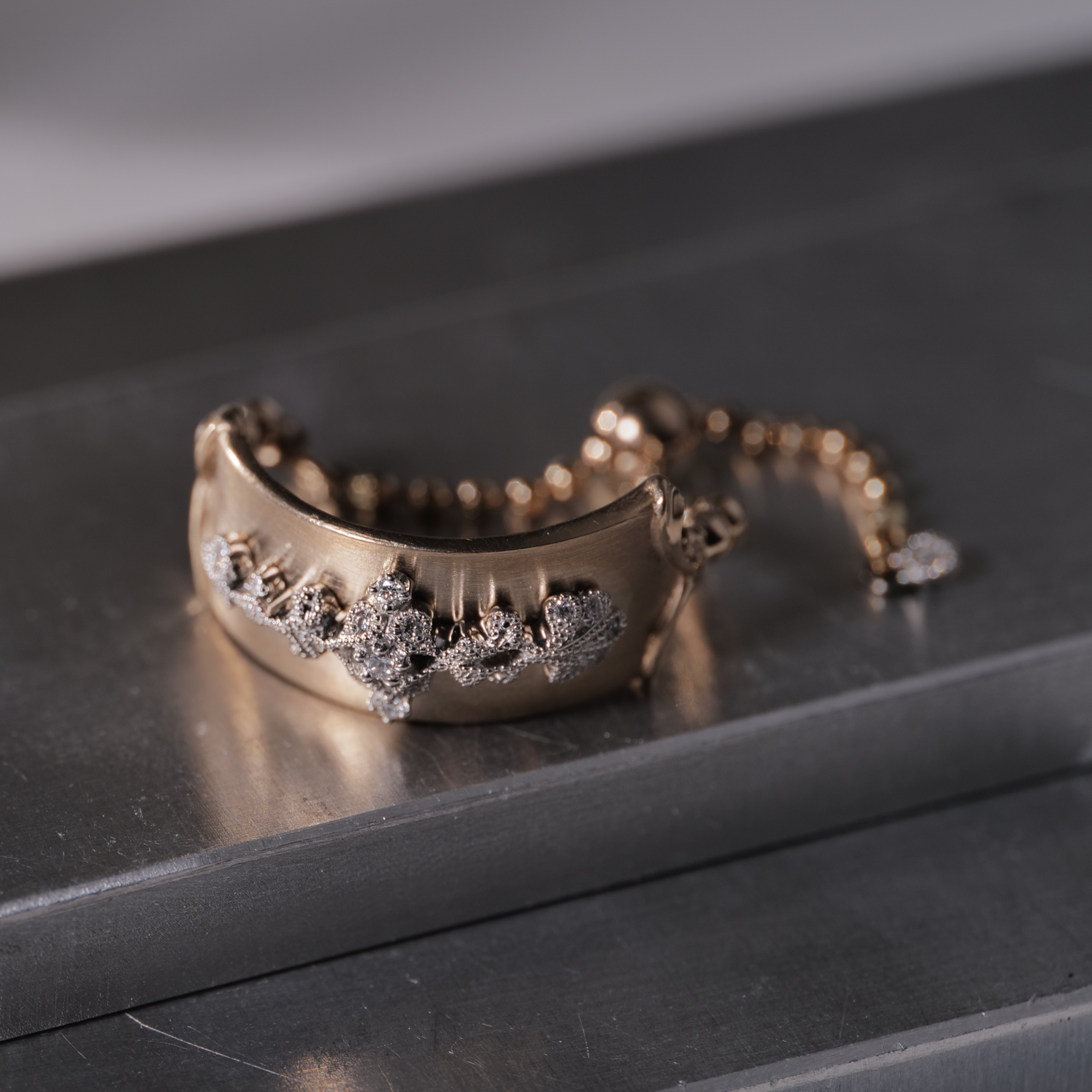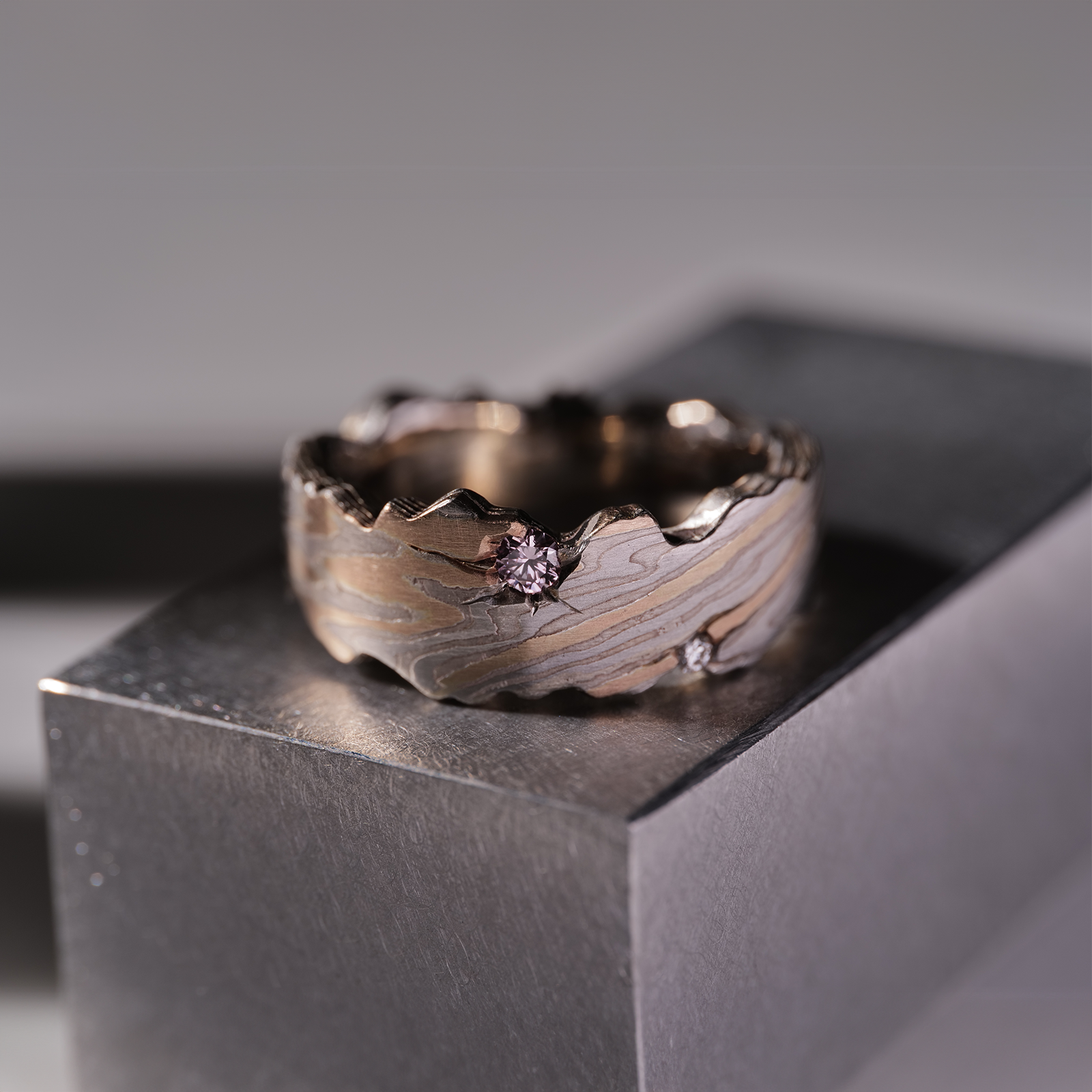 Having traversed over 400 years of highs and lows, Japanese mokumegane has transformed from a symbol of the samurai aristocracy into a cherished form of craftsmanship in modern days. Following the Meiji Restoration’s order to abolish swords, this art form underwent significant changes and has today found new life. Spanish jewellery designer Jaume Labro redefines mokumegane in Japan, drawing inspiration from mountainous landscapes and incorporating the rare Argyle Pink Diamond to enhance the allure of this legendary craft.