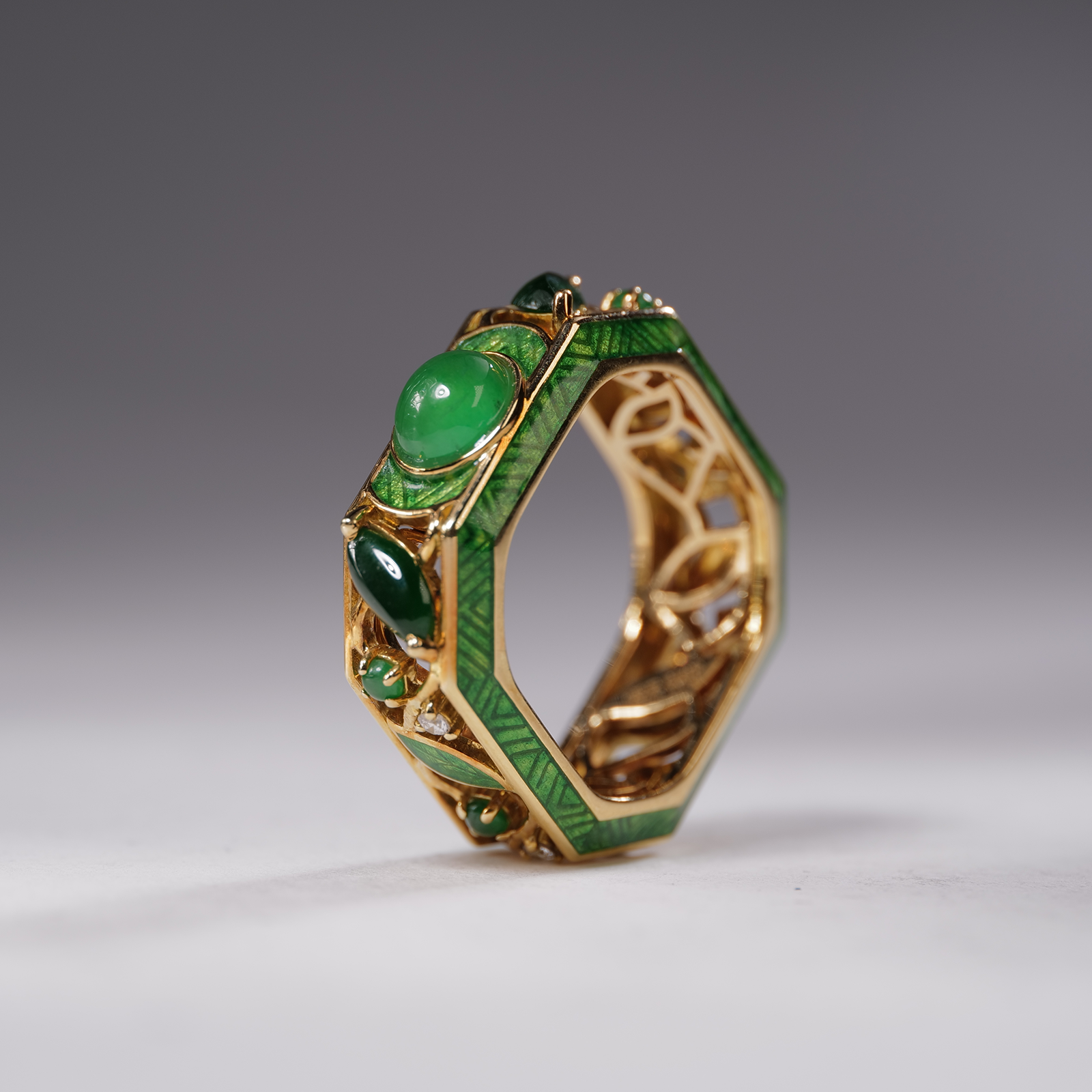 This ring beautifully incorporates the artistic decorative language of Ming and Qing porcelain into jadeite jewellery. It showcases a classical octagonal shape adorned with a meticulously arranged pattern. The vibrant colours created by of high-temperature enamelling, are echoed through the use of natural jadeite and 18K gold.