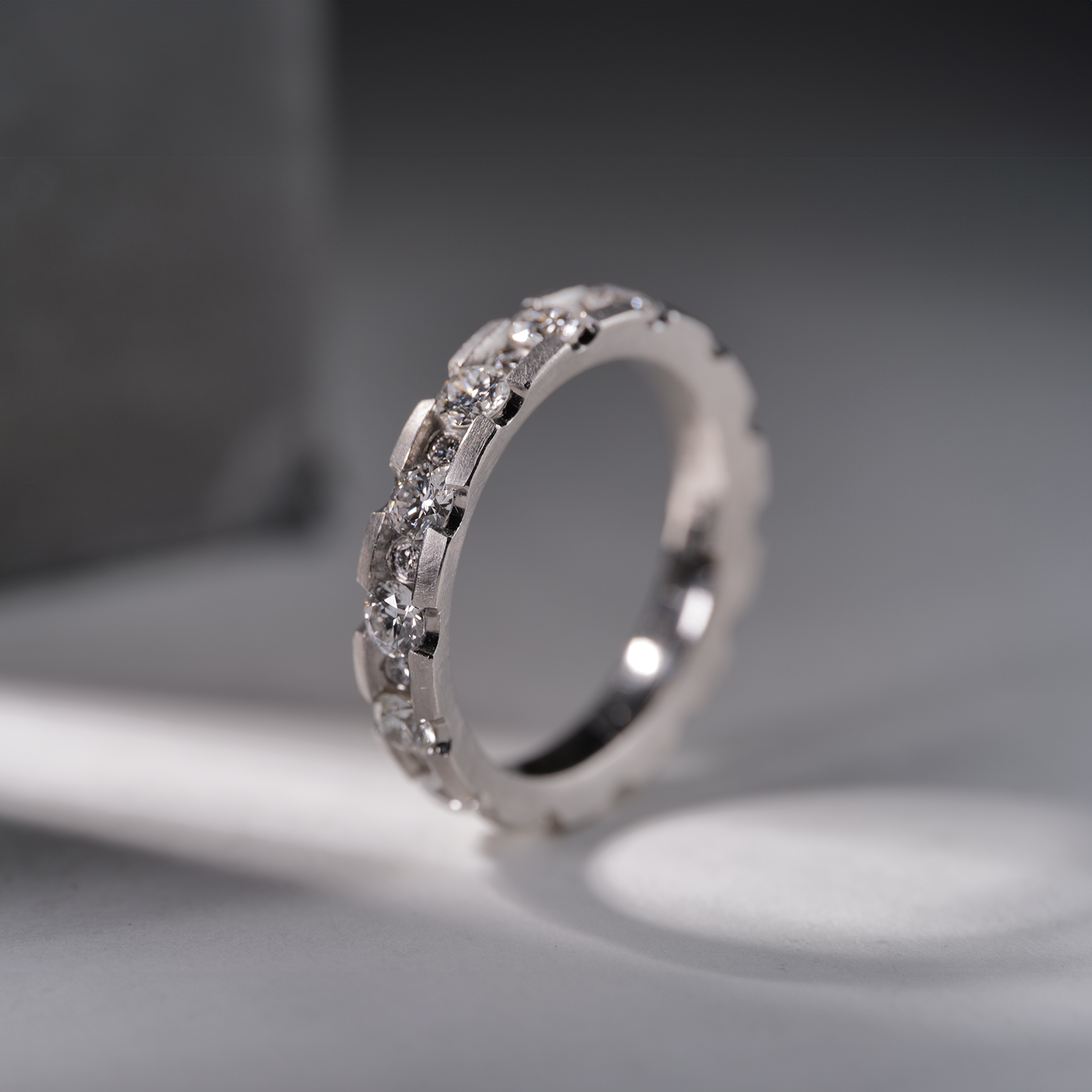 Marion Knorr, known for the poetry she writes about the wedding rings she creates, infuses each of her ring designs with a unique concept and perspective. At first glance, the ring named "Tide" may appear similar to other diamond pavé settings, but upon closer inspection, one can see the meticulous arrangement of layers, lines, and diamond sizes, which gives the ring and diamonds a more three-dimensional effect. This attention to detail and distinctive approach makes Marion’s rings particularly captivating.