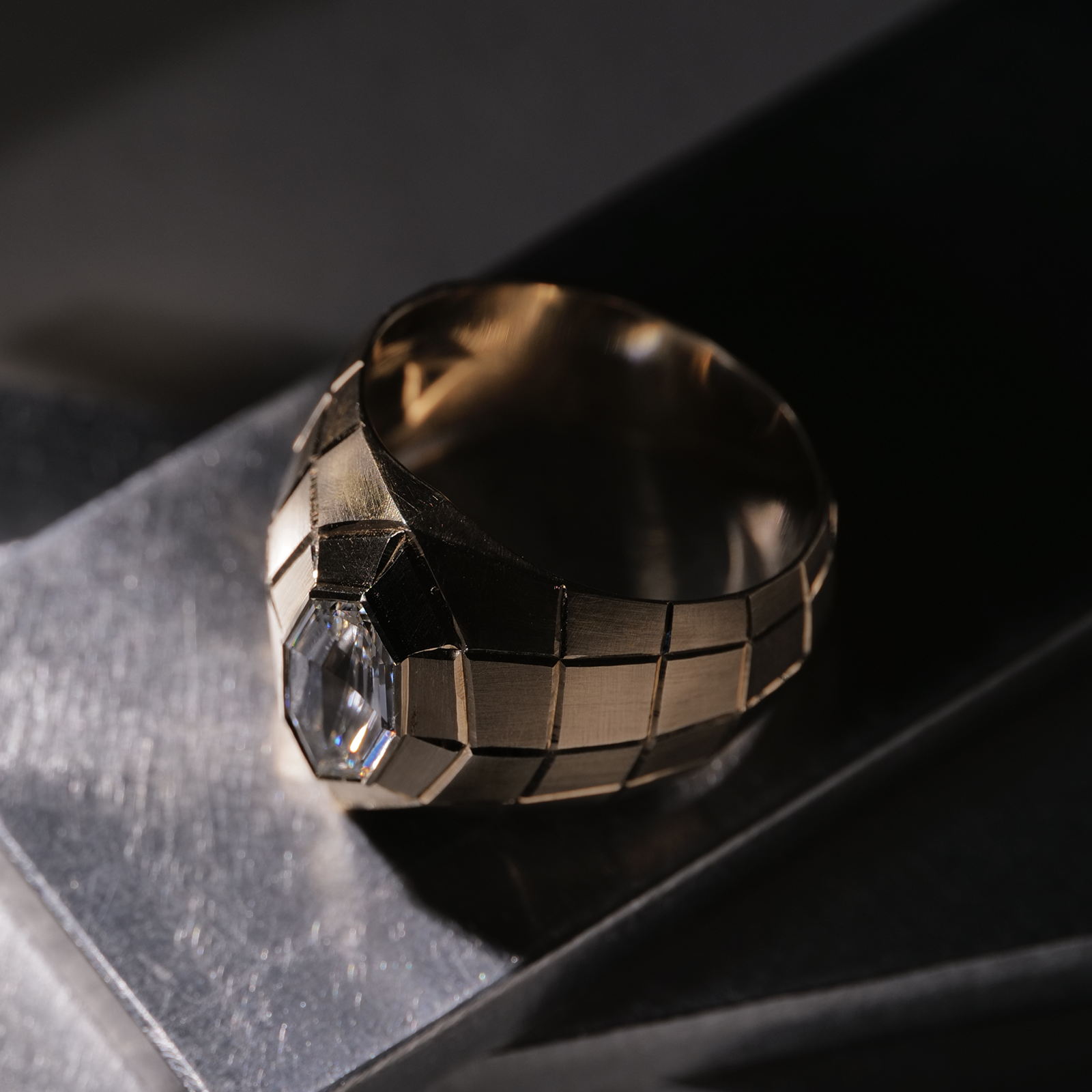 Diamonds with special cut began to gain popularity worldwide in 2020, capturing the admiration of sophisticated collectors. The brand "Lustre Adamantine" presents a ring centred around a unique elongated octagonal step-cut diamond. The contours of this diamond are elegantly extended across the entire ring through exquisite hand engraving techniques, resulting in a striking and radiant piece.