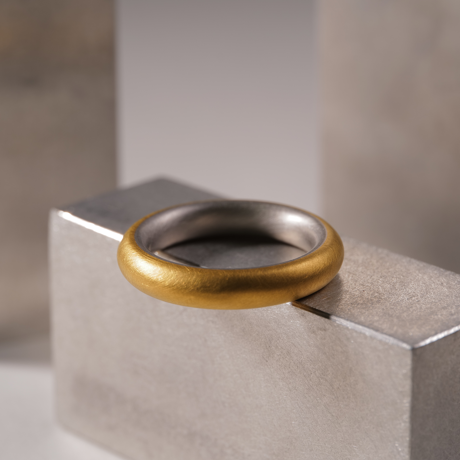 This ring from Niessing, named "Performance", reaches its optimal state not in its brand-new form, but rather as it becomes uneven and textured over time, reflecting the habits of the wearer. The essence of the ring lies in its circular shape and its two-tone design: the base is made of solid gold, while the surface is crafted from hollow gold. With everyday wear, the hollow metal outside experiences friction, gradually developing various dents that serve as a testament to the passage of time in one’s life.