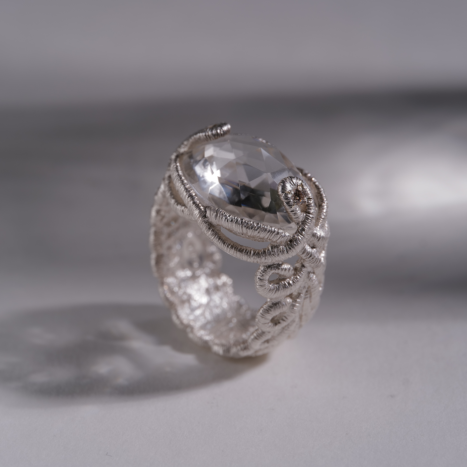 Describing the work of Brigitte Adolph as a magical transformation of her deep passion is most fitting. The German goldsmith, who has a profound love for lace artistry, skillfully transforms delicate silver-white metal pieces into fabric-like lace. The intricate designs are so detailed that their true essence only be appreciated through touch. This ring, adorned with a large white crystal, served as the perfect demonstration of her magical craftsmanship.