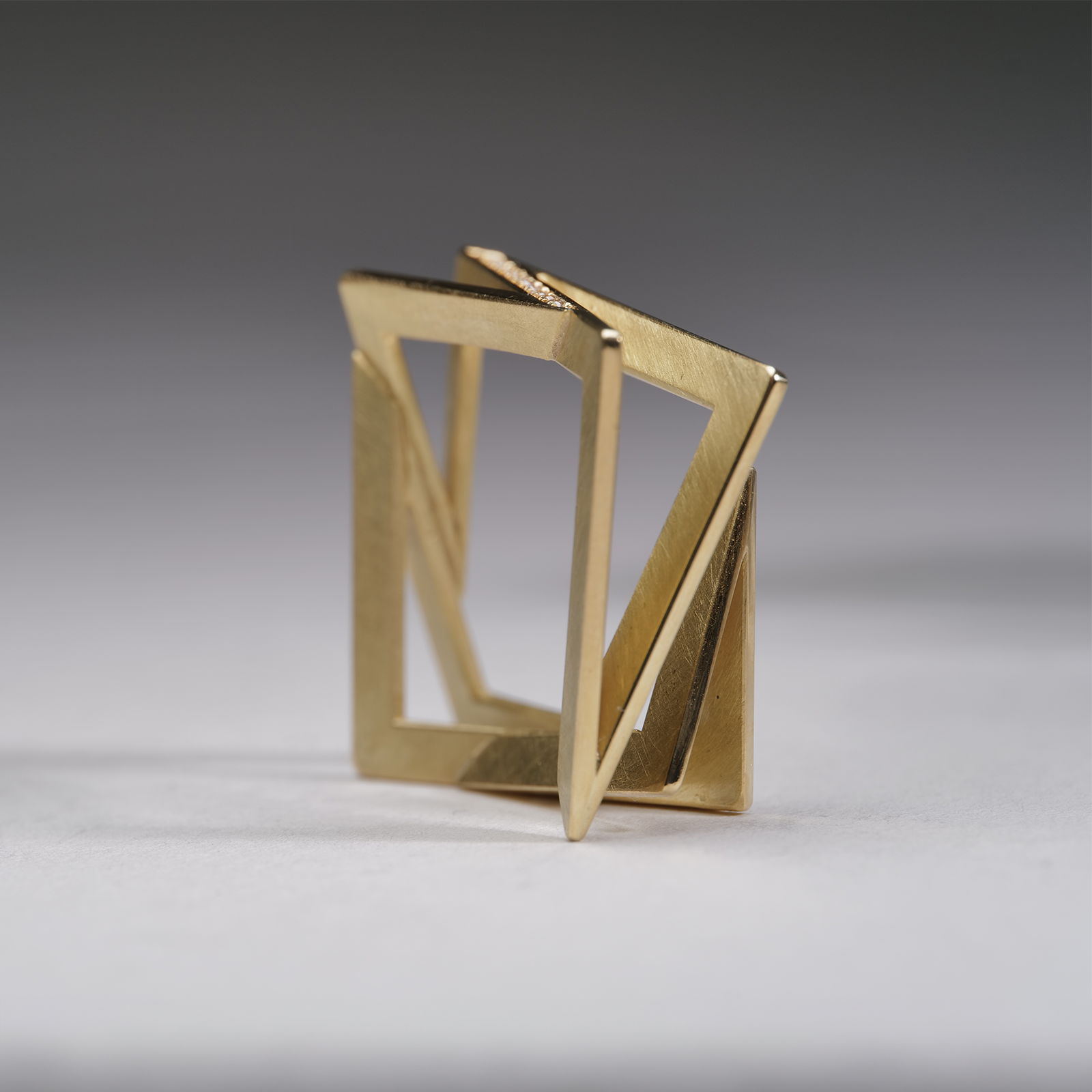 This geometric-style 18K gold ring is crafted by local goldsmith Hugo Yeung. Its sharp, linear, and staggered structural design reflects the artisan's unique approach to jewellery. In Hong Kong's commercially driven jewellery market, this exceptional local creation stands out as a true rarity.
