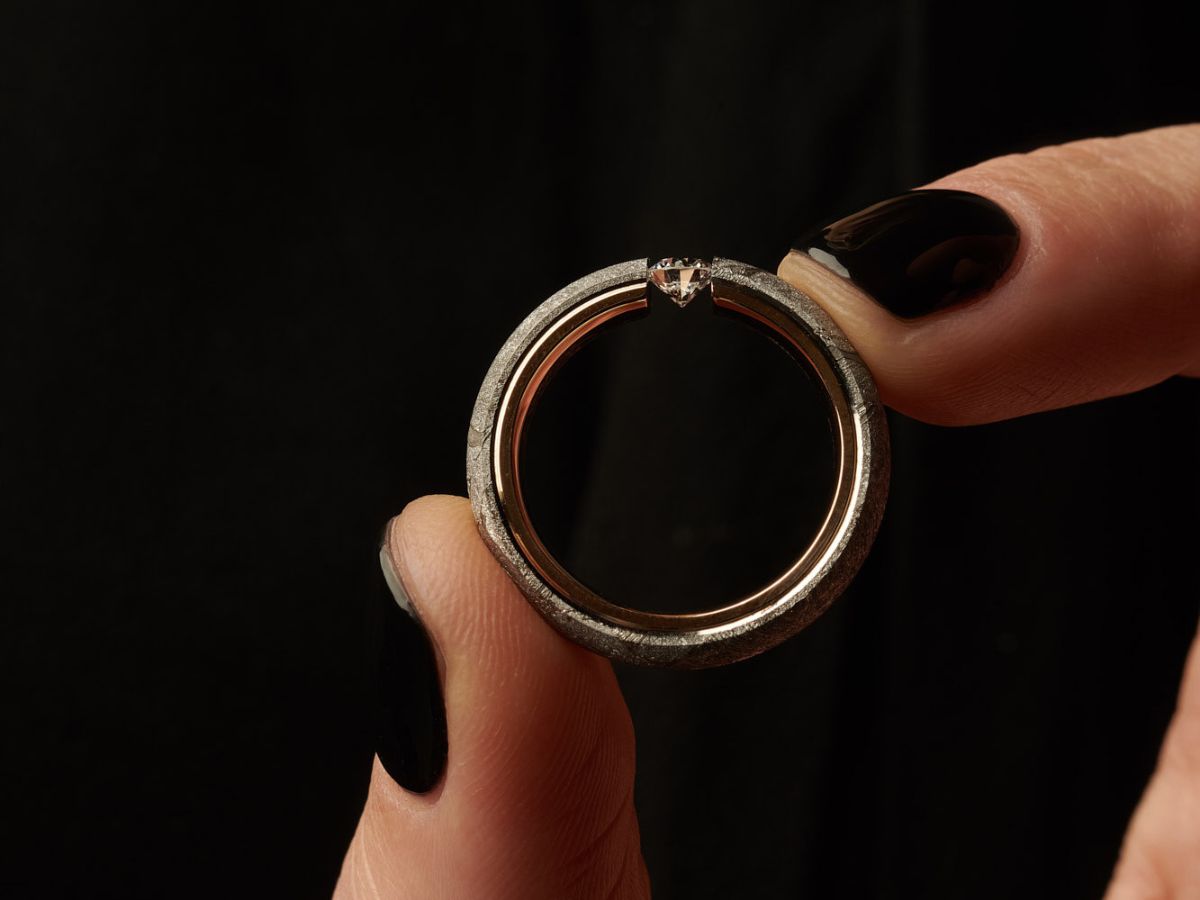 一顆名叫Seymchan的隕石於1967年在俄羅斯被發掘,Martinelis利用這顆獨特的網紋隕石打造戒指,戒指的內環和外環分別由14k金和隕石結合而成,十分適合別具個性的你。