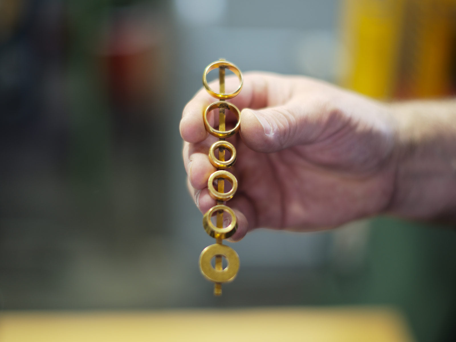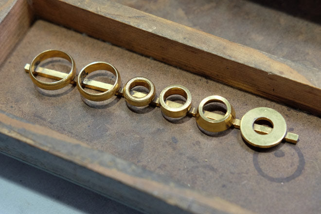 你的手指有多大?根據客人訂製戒指的大小,工匠會擴充或縮小戒指,以符合做下一步的工序。由於戒指被幾次沖壓後變得很堅硬,在擴充時會經過退火程序,以符合修改需要的延展性。